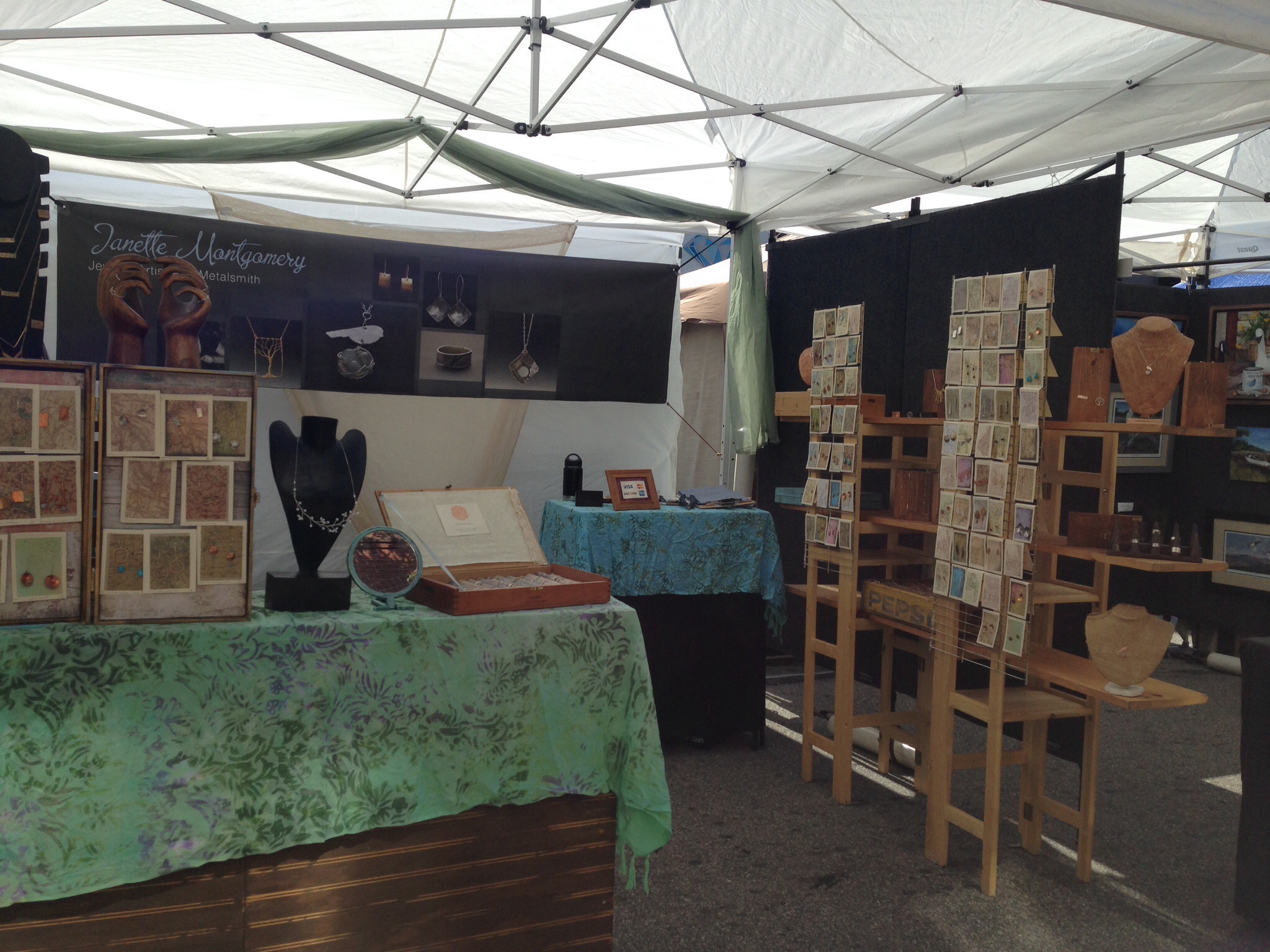 When I began selling at art shows five years ago, I was determinedly to fit my entire set up in my Subaru Legacy. I have since expanded to a slightly larger car; but, it is still a car. Being a jeweler, I know it is much easier to travel with my art than a ceramic artist, but it still takes a lot of furniture to properly display my creations. I am constantly changing my display–it’s sort of an obsession. I found several tables that fit in my car, look professional (very important), and are affordable. I’ve used almost all of these at some point!
