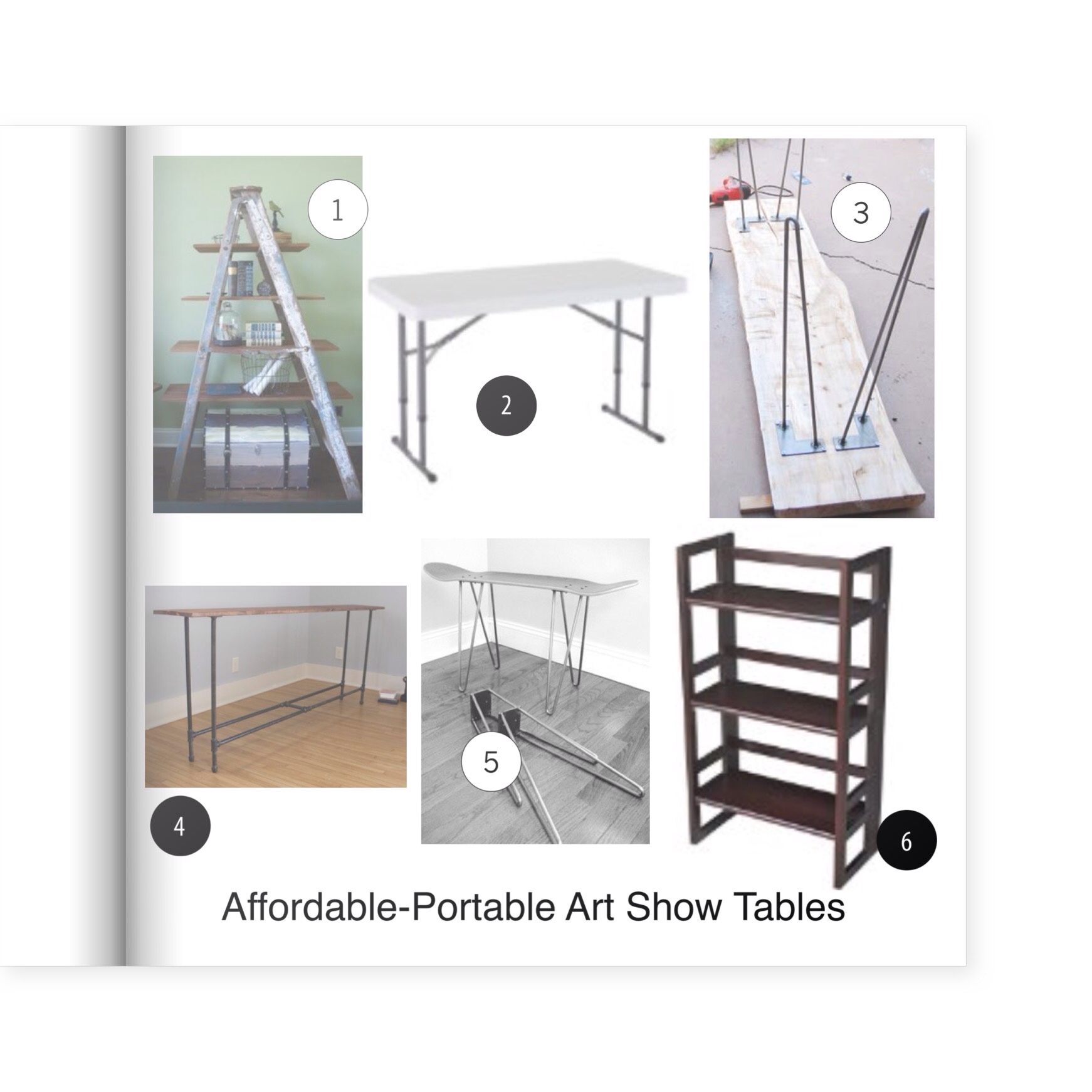 (3) You can purchase hairpin legs online and bolt them on a table top before each show. I love the open look without table linens.