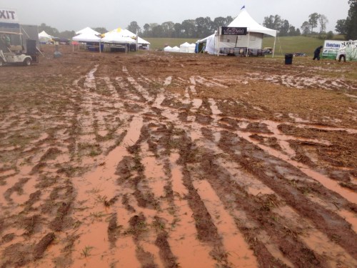 I drove four and a half hours Saturday morning in the rain, still optimistic. Driving down into the muddy festival field was sketchy in my sedan–but this car has gotten me through plenty of sketchy festival grounds–so I proceeded to my assigned location. Setting up for two hours in a steady rain is no treat, but I was ready for this. I had my awesome leopard rain boots (thanks, Mom), new rain coat, and quick dry pants.